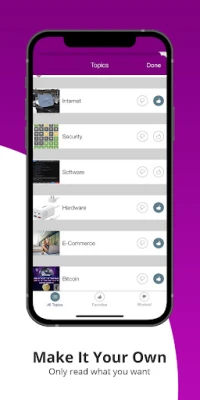- Your very own news feed - choose the topics you want to follow and the topics you want to block - long tap a story to block the source