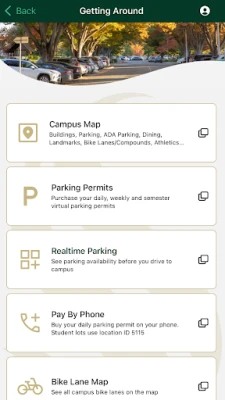 • Campus Map: Searchable maps show building and parking lots, dining, bike lanes,
