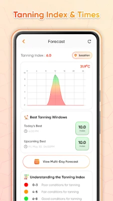 Sun Tracker & Tan Create is a smart app designed to help you tan safely and effectively by providing real-time UV and sun exposure information. Try the Tan UV feature, which offers sun and UV notifications, showing the tanning index for any location, along with the best tanning windows for today or upcoming days. You can also view a multi-day forecast to plan and understand the ideal conditions for safe tanning. This helps reduce the risk of overexposure while maximizing tanning results based on accurate UV data.